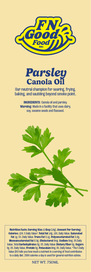 A fresh, herb-infused oil featuring the clean, grassy notes of flat-leaf parsley. Ideal for brightening dressings, drizzling over grilled vegetables, or finishing soups and seafood with a subtle, verdant flavour. Versatile for both cooking and garnishing.