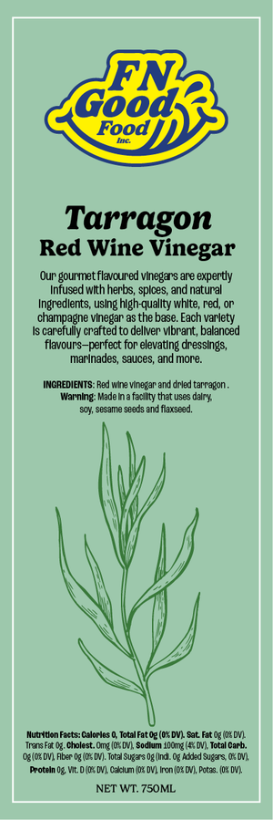 Tarragon Red Wine Vinegar: An elegantly herbal vinegar with the subtle anise-like flavour of tarragon. Ideal for chicken, fish, and creamy sauces.