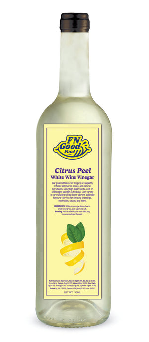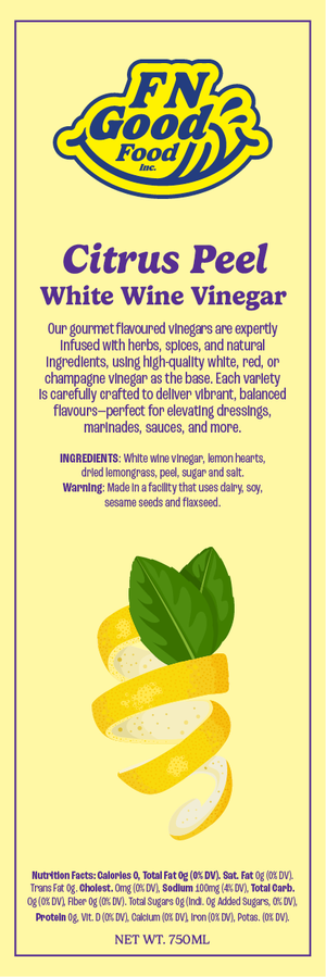 Citrus Peel White Wine Vinegar: A bright, zesty vinegar with citrus peel notes. Lifts seafood and light dishes.