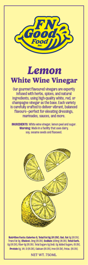 Lemon White Wine Vinegar: A crisp vinegar with zesty lemon. Brightens poultry and vegetable dishes.