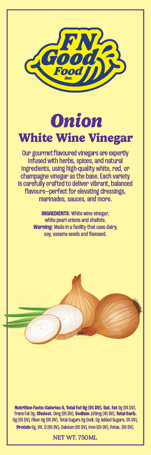 Onion White Wine Vinegar: A sharp, tangy vinegar with onion flavour. Essential for pickling and vinaigrettes.